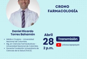 Continuing its cycle of conferences, on Monday, April 28, at 2:00 PM, the lecture "Chrono-Pharmacology" will be presented by Daniel Ricardo Torres Bahamón, Medical Doctor from the National University of Colombia, Master of Pharmaceutical Sciences, and Lecturer at the Fundación Universitaria de Ciencias de la Salud (FUCS).